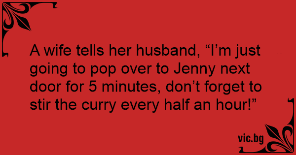 A wife tells her husband, “I’m just going to pop over to Jenny next door for 5 minutes, don’t forget to stir the curry every half an hour!”