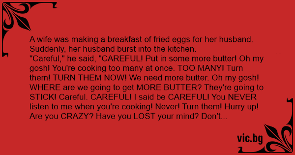 A wife was making a breakfast of fried eggs for her husband. Suddenly, her husband burst into the kitchen.