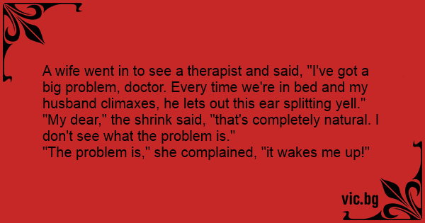 A wife went in to see a therapist and said, "I've got a big problem, doctor. Every time we're in bed and my husband climaxes, he lets out this ear splitting yell."