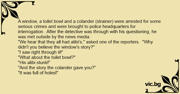 A window, a toilet bowl and a colander (strainer) were arrested for some serious crimes and were brought to police headquarters for interrogation. After the detective was through with his questioning, he was met outside by the news media.