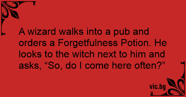 A wizard walks into a pub and orders a Forgetfulness Potion. He looks to the witch next to him and asks, “So, do I come here often?”