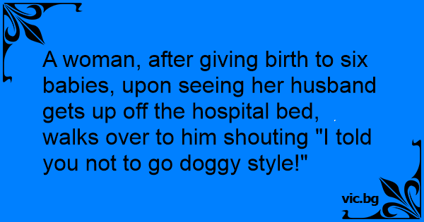 Жена, след като родила шест бебета, виждайки съпруга си да става от болничното легло, се приближава до него с казва: "Казах ти да не го правим кучешката!"
