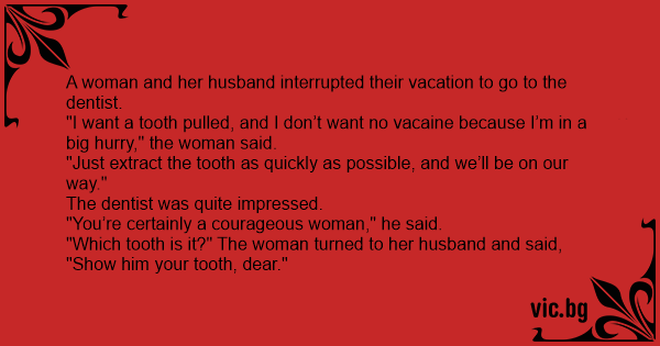 "Which tooth is it?" The woman turned to her husband and said, "Show him your tooth, dear."