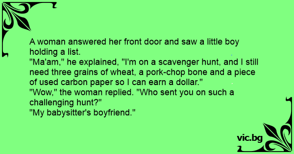 "Ma'am," he explained, "I'm on a scavenger hunt, and I still need three grains of wheat, a pork-chop воnе and a piece of used carbon paper so I can earn a dollar."