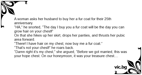 A woman asks her husband to buy her a fur coat for their 25th anniversary.