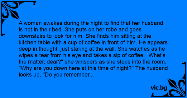 A woman awakes during the night to find that her husband is not in their bed. She puts on her robe and goes downstairs to look for him. She finds him sitting at the kitchen table with a cup of coffee in front of him. He appears deep in thought, just staring at the wall. She watches as he wipes a tear from his eye and takes a sip of coffee. "What's the matter, dear?" she whispers as she steps into the room. "Why are you down here at this time of night?" The husband looks up, "Do you remember 20 years ago when we were dating, and you were only 17?" he asks solemnly. The wife is touched, thinking her husband is so caring and sensitive. "Yes, I do," she replies. The husband pauses. The words are not coming easily. "Do you remember when your father caught us in the backseat of my car?"