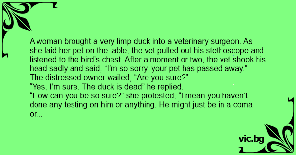 The vet looked at the woman and said, “I’m sorry, but as I said, this is most definitely, 100% certifiably, a dead duck.”