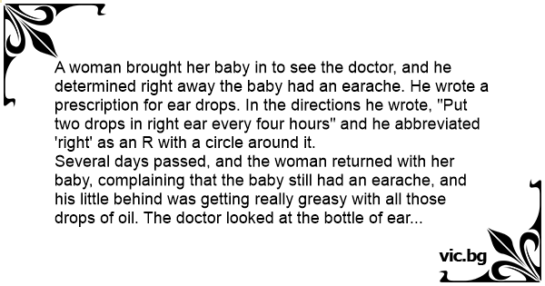 A woman brought her baby in to see the doctor, and he determined right away the baby had an earache. He wrote a prescription for ear drops. In the directions he wrote, "Put two drops in right ear every four hours" and he abbreviated 'right' as an R with a circle around it.