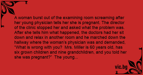 A woman burst out of the examining room screaming after her young physician tells her she is pregnant. The director of the clinic stopped her and asked what the problem was. After she tells him what happened, the doctors had her sit down and relax in another room and he marched down the hallway where the woman’s physician was and demanded, “What is wrong with you? Mrs. Miller is 60 years old, has six grown children and nine grandchildren, and you told her she was pregnant?” The young physician continued to write his notes and without looking up at his superior, asked, “Does she still have the hiccups?”
