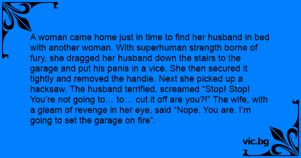 A woman came home just in time to find her husband in bed with another woman. With superhuman strength borne of fury, she dragged her husband down the stairs to the garage and put his реnis in a vice. She then secured it tightly and removed the handle. Next she picked up a hacksaw. The husband terrified, screamed “Stop! Stop! You’re not going to… to… cut it off are you?!” The wife, with a gleam of revenge in her eye, said “Nope. You are. I’m going to set the garage on fire”.