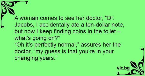 A woman comes to see her doctor, “Dr. Jacobs, I accidentally ate a ten-dollar note, but now I keep finding coins in the toilet – what’s going on?”