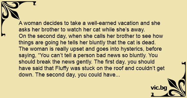 The woman is really upset and goes into hysterics, before saying, “You can’t tell a person bad news so bluntly. You should break the news gently. The first day, you should have said that Fluffy was stuck on the roof and couldn’t get down. The second day, you could have said that she had fallen, but the vet said she would be okay. Then on the third day you could have said that she died from complications.”
