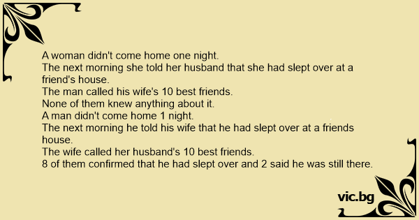 Der Mann war über Nacht nicht zu Hause. Am Morgen erzählt er seiner Frau, dass er bei einem Kumpel übernachtet hätte. Seine Frau ruft zehn seiner besten Freunde an. Abends stellt sie ihren Gatten...