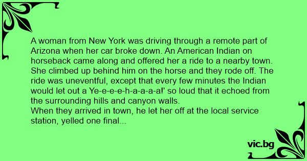A woman from New York was driving through a remote part of Arizona when her car broke down. An American Indian on horseback came along and offered her a ride to a nearby town. She climbed up behind him on the horse and they rode off. The ride was uneventful, except that every few minutes the Indian would let out a Ye-e-e-e-h-a-a-a-a!' so loud that it echoed from the surrounding hills and canyon walls. When they arrived in town, he let her off at the local service station, yelled one final 'Ye-e-e-e-h-a-a-a-a!' and rode off. "What did you do to get that Indian so excited?" asked the service-station attendant. "Nothing," the woman answered "I merely sat behind him on the horse, put my arms around his waist, and held onto the saddle horn so I wouldn't fall off." "Lady," the attendant said, "Indians don't use saddles."