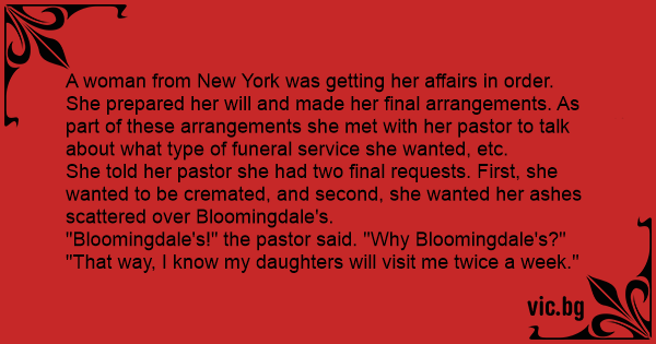 She told her pastor she had two final requests. First, she wanted to be cremated, and second, she wanted her ashes scattered over Bloomingdale's.