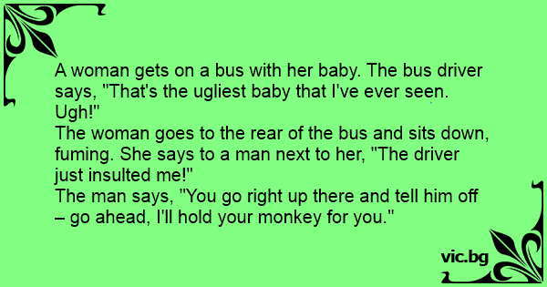 En dame går på bussen med babyen sin, da bussjåføren utbryter: - «Det er den styggeste babyen jeg noen gang har sett. Æsj!» Damen går bak i bussen, setter seg ned og er rasende. «Sjåføren fornærmet...