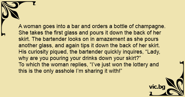 His curiosity piqued, the bartender quickly inquires, “Lady, why are you pouring your drinks down your skirt?”