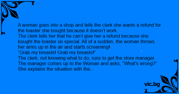 The clerk tells her that he can’t give her a refund because she bought the toaster on special. All of a sudden, the woman throws her arms up in the air and starts screaming!