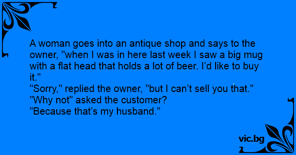 A woman goes into an antique shop and says to the owner, "when I was in here last week I saw a big mug with a flat head that holds a lot of вееr. I’d like to buy it."
