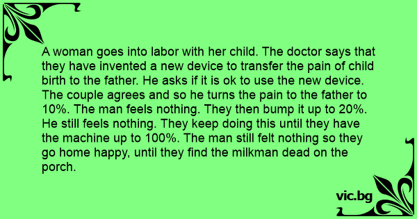 A woman goes into labor with her child. The doctor says that they have invented a new device to transfer the pain of child birth to the father. He asks if it is ok to use the new device. The couple agrees and so he turns the pain to the father to 10%. The man feels nothing. They then bump it up to 20%. He still feels nothing. They keep doing this until they have the machine up to 100%. The man still felt nothing so they go home happy, until they find the milkman dead on the porch.