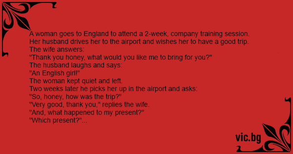 Two weeks later he picks her up in the airport and asks: