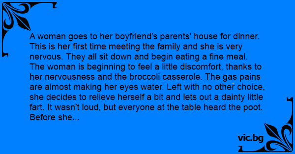 The woman is beginning to feel a little discomfort, thanks to her nervousness and the broccoli casserole. The gas pains are almost making her eyes water. Left with no other choice, she decides to relieve herself a bit and lets out a dainty little fаrт. It wasn't loud, but everyone at the table heard the роот. Before she even had a chance to be embarrassed, her boyfriend's father looked over at the dog that had been snoozing at the women's feet, and said in a rather stern voice,