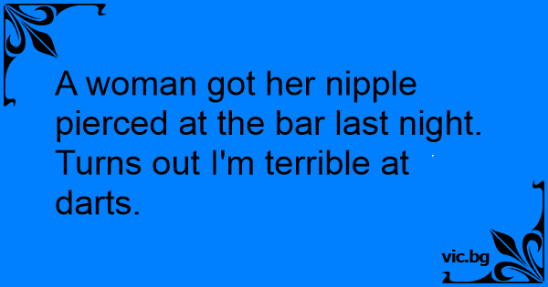 Снощи в бара, една жена получи пиърсинг. Оказа се, че съм доста некадърен играч на дартс