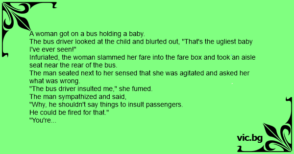 Een vrouw staat samen met haar baby op de arm te wachten bij een bushalte. Als de bus aan komt en de vrouw instapt zegt de buschauffeur: "Dat is de lelijkste baby die ik ooit heb gezien!" De vrouw...