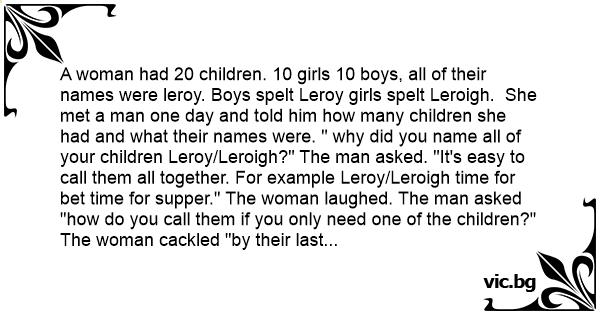 A woman had 20 children. 10 girls 10 boys, all of their names were leroy. Boys spelt Leroy girls spelt Leroigh. She met a man one day and told him how many children she had and what their names were. " why did you name all of your children Leroy/Leroigh?" The man asked. "It's easy to call them all together. For example Leroy/Leroigh time for bet time for supper." The woman laughed. The man asked "how do you call them if you only need one of the children?" The woman cackled "by their last names of course!"