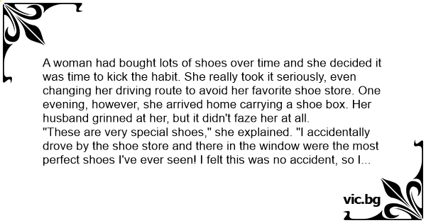 A woman had bought lots of shoes over time and she decided it was time to kick the habit. She really took it seriously, even changing her driving route to avoid her favorite shoe store. One evening, however, she arrived home carrying a shoe box. Her husband grinned at her, but it didn't faze her at all.