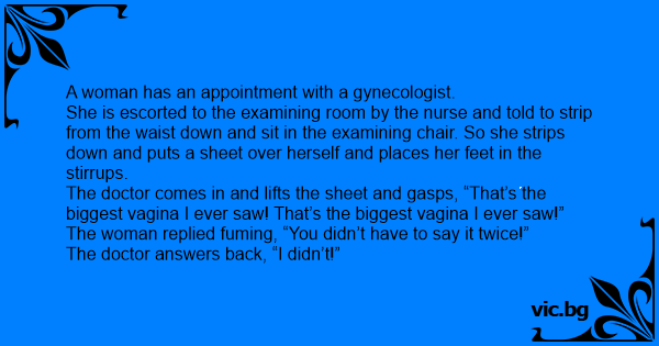 The doctor comes in and lifts the sheet and gasps, “That’s the biggest vаginа I ever saw! That’s the biggest vаginа I ever saw!”