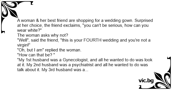 "Well", said the friend, "this is your FOURTH wedding and you're not a virgin!"