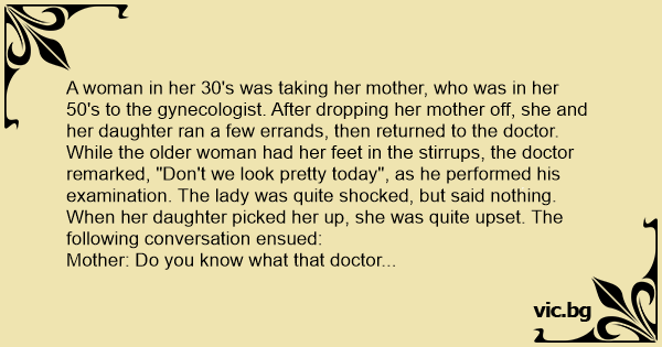 A woman in her 30's was taking her mother, who was in her 50's to the gynecologist. After dropping her mother off, she and her daughter ran a few errands, then returned to the doctor. While the older woman had her feet in the stirrups, the doctor remarked, "Don't we look pretty today", as he performed his examination. The lady was quite shocked, but said nothing.
