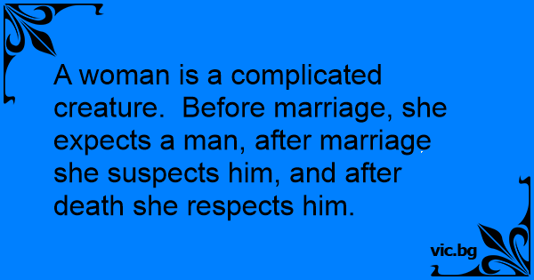 A woman is a complicated creature. Before marriage, she expects a man, after marriage she suspects him, and after death she respects him.