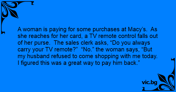 A woman is paying for some purchases at Macy’s. As she reaches for her card, a TV remote control falls out of her purse. The sales clerk asks, “Do you always carry your TV remote?” “No.” the woman says, “But my husband refused to come shopping with me today. I figured this was a great way to pay him back.”