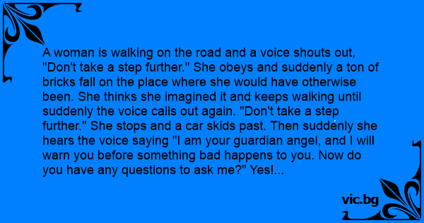 A woman is walking on the road and a voice shouts out, "Don't take a step further." She obeys and suddenly a ton of bricks fall on the place where she would have otherwise been. She thinks she imagined it and keeps walking until suddenly the voice calls out again. "Don't take a step further." She stops and a car skids past. Then suddenly she hears the voice saying "I am your guardian angel, and I will warn you before something bad happens to you. Now do you have any questions to ask me?" Yes! Shouts the woman, "Just where were you on my wedding day!"