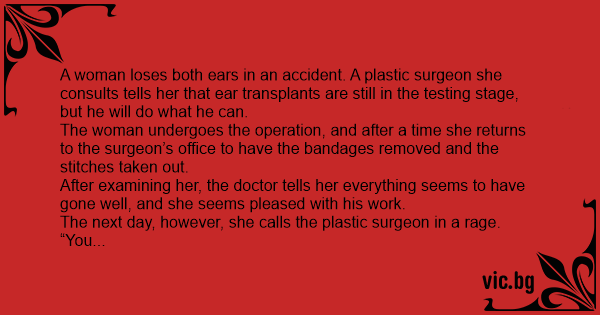 A woman loses both ears in an accident. A plastic surgeon she consults tells her that ear transplants are still in the testing stage, but he will do what he can. The woman undergoes the operation, and after a time she returns to the surgeon’s office to have the bandages removed and the stitches taken out. After examining her, the doctor tells her everything seems to have gone well, and she seems pleased with his work. The next day, however, she calls the plastic surgeon in a rage. “You know what you did?” she screams. “You gave me a man’s ears.” “Well,” says the surgeon, “an ear is an ear. What is wrong? Can’t you hear?” “I hear everything,” she says. “The problem is I do not understand anything I am told.”