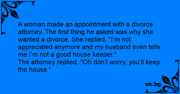 A woman made an appointment with a divorce attorney. The first thing he asked was why she wanted a divorce. She replied, "I’m not appreciated anymore and my husband even tells me I’m not a good house keeper."