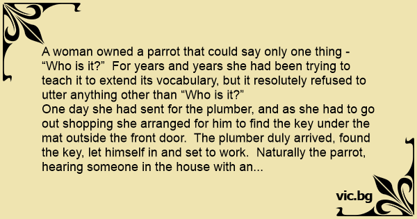 The parrot was not satisfied - he wanted to see who the stranger was. “Who is it? He called again, and again the plumber yelled out “It’s the plumber!” Again and again the bird called out “Who is it?” and again and again the poor bewildered plumber responded - “It’s the plumber! It’s the plumber! IT”S THE PLUMBER!” Eventually in a fury he roamed the house, going from room to room, trying to find out who was calling him - but he failed to realize that it was the parrot. This went on for a while, with him dashing around the house, growing increasingly desperate, and shouting out “It’s the plumber!” until eventually the wretched man fainted clean away in the hall!