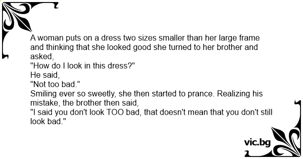 A woman puts on a dress two sizes smaller than her large frame and thinking that she looked good she turned to her brother and asked,