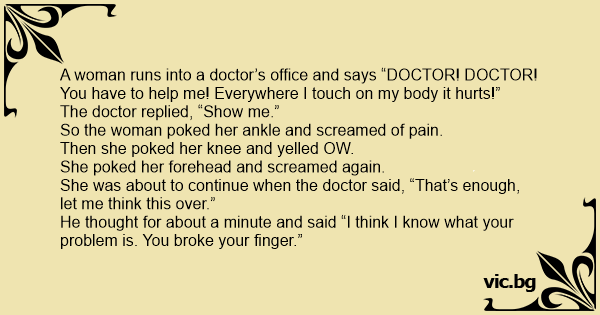 Doctor, Doctor Me duele todoo... Mire me toko aki con el deo y me duele aki tambie,y aki! -Doctor dice: Usted lo k tiene es el deo roto.