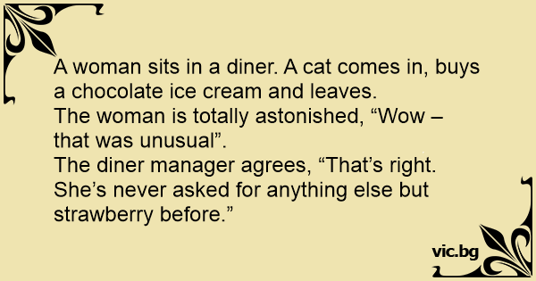 A woman sits in a diner. A cat comes in, buys a chocolate ice cream and leaves.