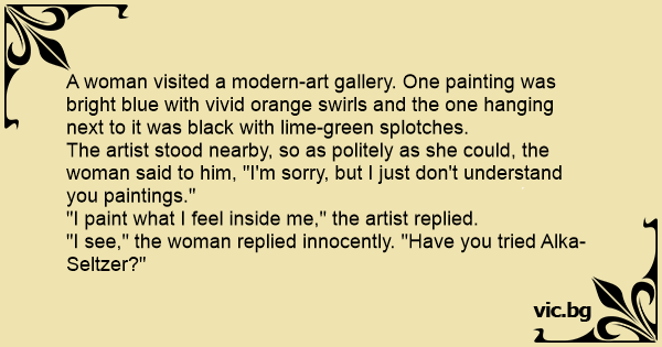 The artist stood nearby, so as politely as she could, the woman said to him, "I'm sorry, but I just don't understand you paintings."