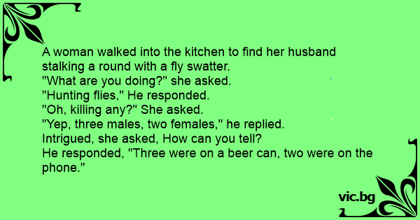 Жената влегува во кујна и го начекува мажот како стои со тепалка за муви во рацете и шета низ кујната. Што правиш? Тепам муви. Па утепа ли некоја? Да, пет машки три женски. Жената изнервирана: А...