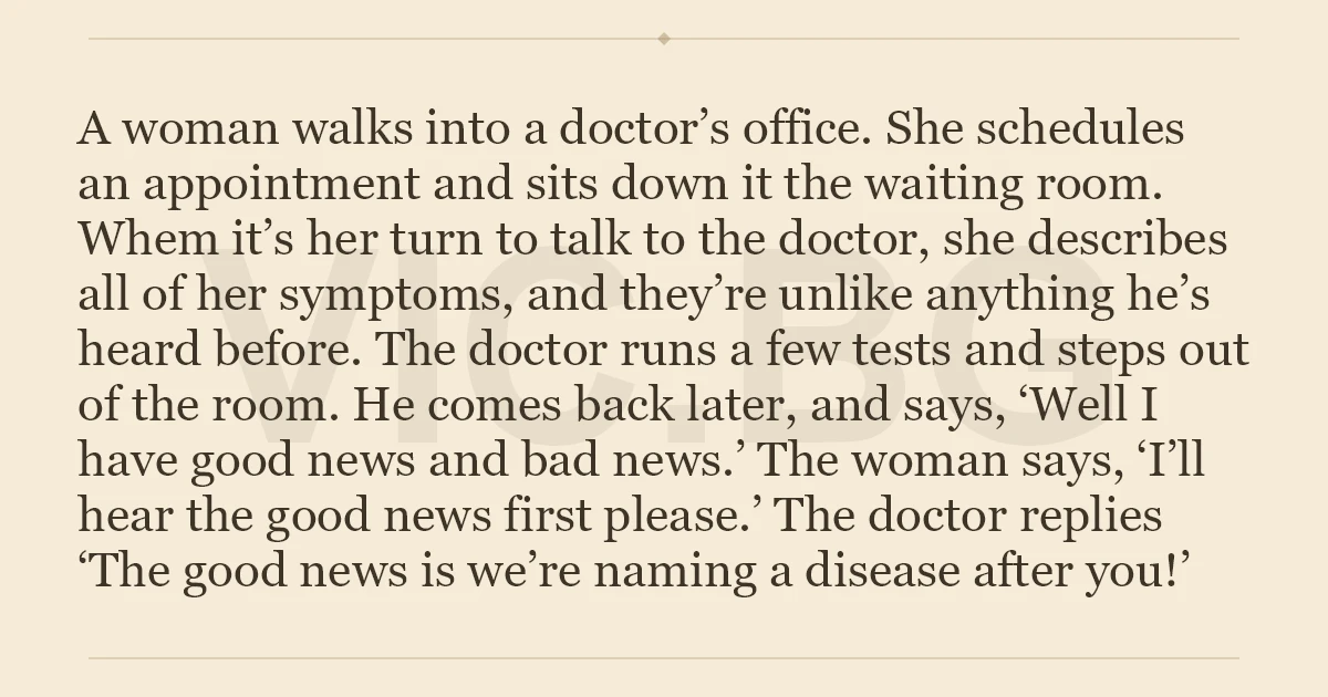 A woman walks into a doctor’s office. She schedules an appointment and sits down it the waiting room. Whem it’s her turn to talk to the doctor, she describes all of her symptoms, and they’re unlike anything he’s heard before. The doctor runs a few tests and steps out of the room. He comes back later, and says, ‘Well I have good news and bad news.’ The woman says, ‘I’ll hear the good news first please.’ The doctor replies ‘The good news is we’re naming a disease after you!’