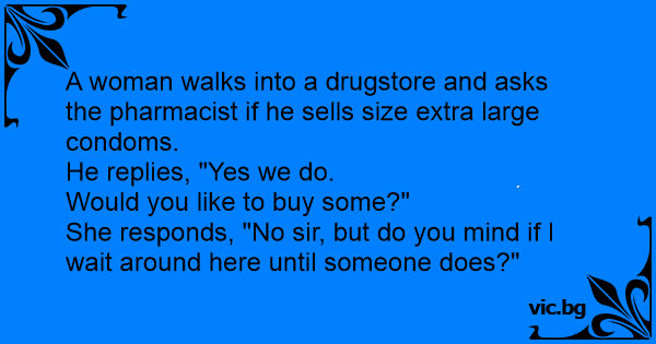 Kommt eine Frau in eine Apotheke und erkundigt sich nach Kondomen in Übergröße. Der Apotheker will wissen, ob und wie viele sie haben will und sie antwortet: "Eigentlich keine, aber macht es ihnen...