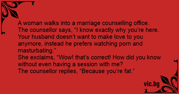 The counsellor says, “I know exactly why you’re here. Your husband doesn’t want to make love to you anymore, instead he prefers watching роrn and маsтurватing.”