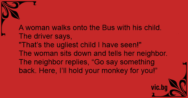 En dame går på bussen med babyen sin, da bussjåføren utbryter: - «Det er den styggeste babyen jeg noen gang har sett. Æsj!» Damen går bak i bussen, setter seg ned og er rasende. «Sjåføren fornærmet...