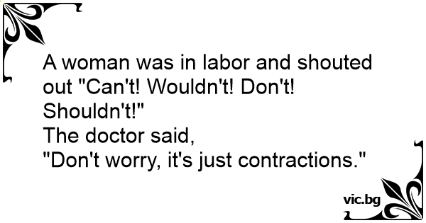 A woman was in labor and shouted out "Can't! Wouldn't! Don't! Shouldn't!"