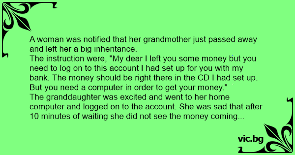 The granddaughter was excited and went to her home computer and logged on to the account. She was sad that after 10 minutes of waiting she did not see the money coming out from the CD-ROM insert. Her husband came home to see his wife sitting in front of the computer with a very sad face. He asked his wife, "What's the matter my lovely wife I thought you would be happy to received that kind of inheritance?"